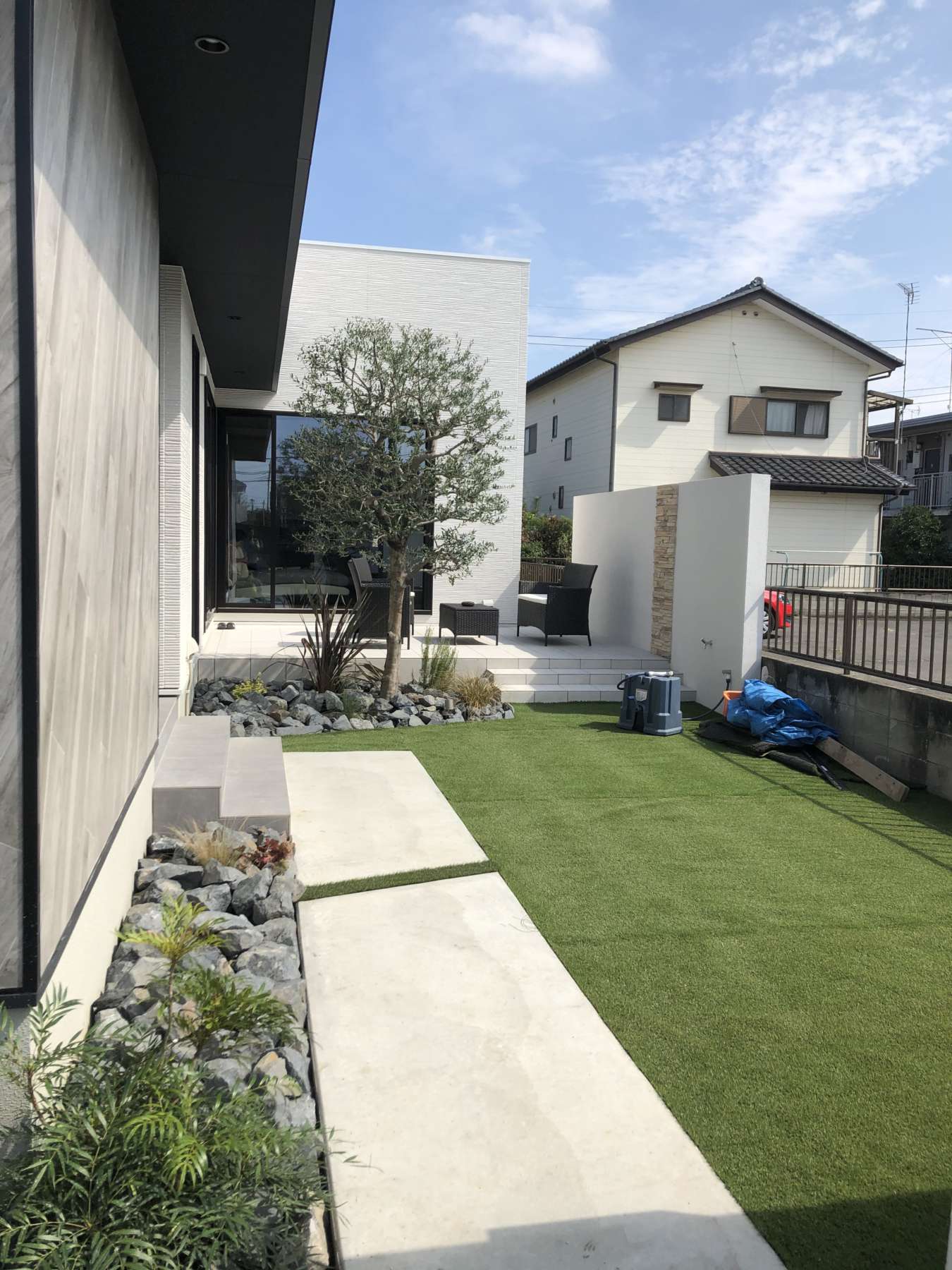 施工内容:門塀 カースペース 植栽 景石 タイルデッキ 目隠し タイル貼り 照明 and more